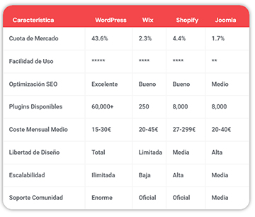 | Característica | WordPress | Wix | Shopify | Joomla |